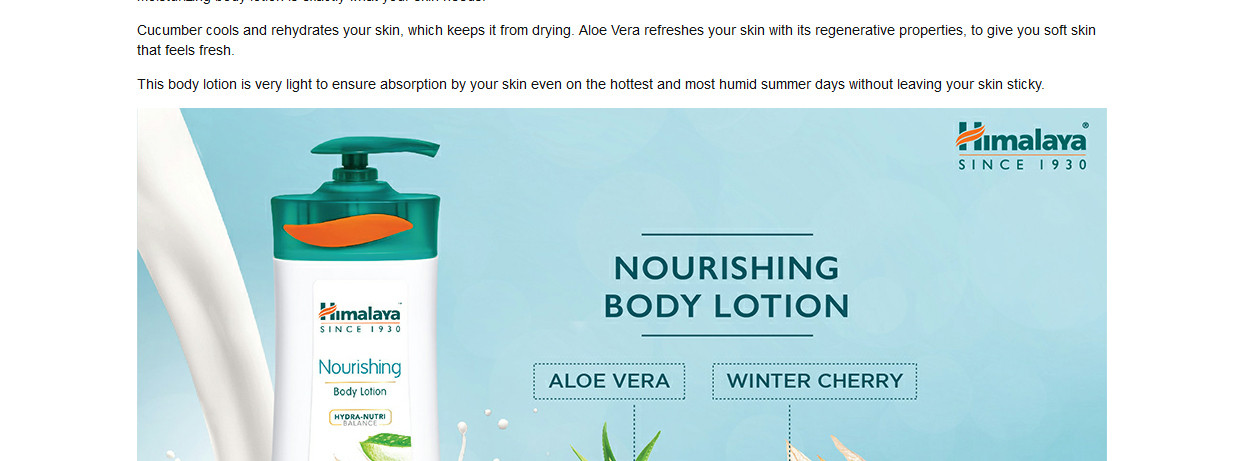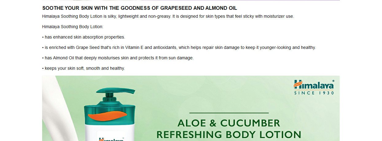 Soothing Body Lotion is a silky, lightweight, and non-greasy body lotion that combines all the goodness of naturally derived ingredients to soothe Himalayas Soothing Body Lotion is a silky, lightweight and non-greasy body lotion that combines all the goodness of naturally derived ingredients to soothe and moisturize your skin, making it look noticeably softer and smoother.