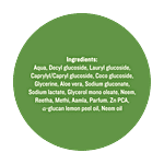 Aqua, Decyl Glucoside, Lauryl Glucoside, Caprylyl/capryl Glucoside, Coco-glucoside, Glycerine, Aloe Barbadensis (Aloe Vera) Juice*, Sodium Gluconate, Sodium Lactate, Glycerol Monooleate, Azadirachta Indica (neem) Infusion*, Sapindus Mukarossi (reetha) Extract*, Trigonella Foenum Graecum (methi Ka) Extract*, Emblica Officinalis (amla) Extract*, Parfum**, Zn Pca, α-glucan Oligosaccharide, Sodium Levulinate, Xanthan Gum, Citric Acid, Potassium Sorbate, Citrus Limonum (lemon Peel) Oil, Azadirachta Indica (neem) Oil, Linalool**, Limonene**, Geraniol**, Citral** *from Certified Organic Farms **from Essential Oils.