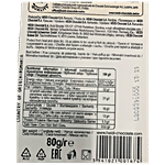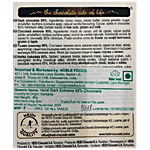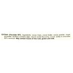 Dark chocolate 85%. Ingredients: cocoa mass, cocoa butter, cocoa powder, sugar, emulsifier: soy lecithin, flavor: natural vanilla extract. Cocoa solids: 85% min