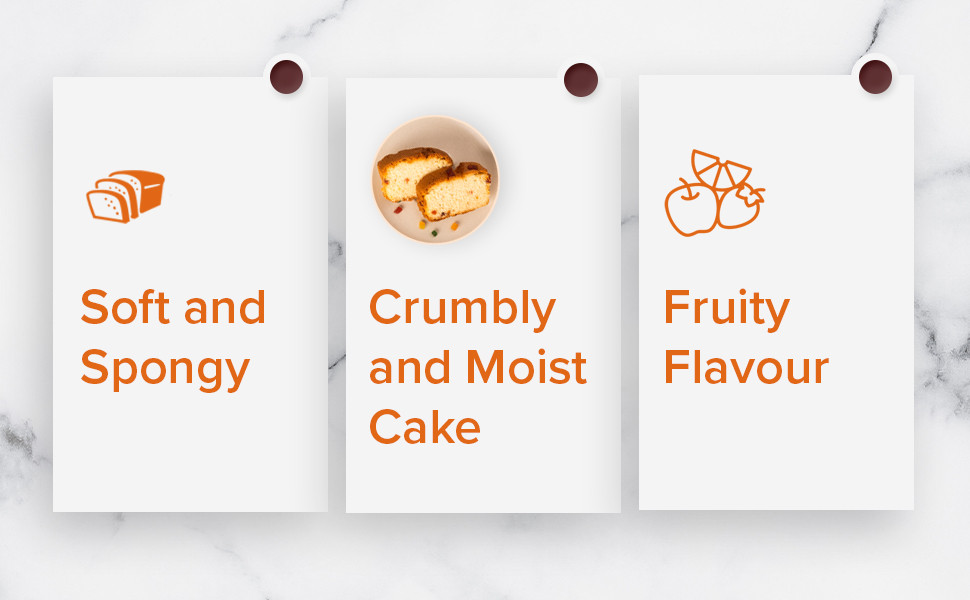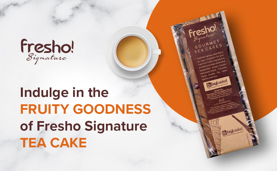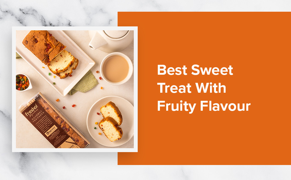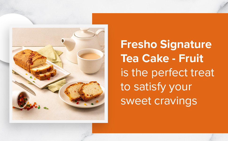 The Fresho Signature Fruit Tea Cake with the tutti-fruity inside makes for a perfect evening snack served alongside a cup of hot chai. Made with premium quality ingredients, these cake slices make your conversations sweeter. The cake is soft and spongy and the egg and milk combination makes it more fluffy. Enjoy this cholesterol-free cake any time of the day or night. Also explore Fresho Signature's full range of pastries, brownies, and doughnuts.