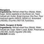 | Refined Wheat Flour (Maida), Water, Iodized Salt, Sugar, Baker's Yeast, Butter, Class II Preservative (INS 282), Acidity Regulator (INS 330). | Refined wheat flour, Sugar, Yeast, Iodized Salt, Bread Improver [Whole Wheat Flour, Starch, Emulsifier (INS 481), Antioxidant (INS 300), Enzymes (Xylanase, Amylase (INS 1100)] | Refined wheat flour, Sugar, yeast, Iodized salt, Bread Improver[Whole wheat flour, Starch, Emulsifier (INS 481), Antioxidant (INS 300), Enzymes (Xylanase, Amylase (INS 1100)] | Refined wheat flour(Maida), Water, Sugar, Baker's yeast, Soya powder, Iodized salt, Bread Improver (Maize starch, Anti caking agent (INS 170(I), Antioxidant (INS 300), Enzymes (INS 1100(I), INS 1102, INS 1104) |