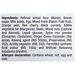 Refined Wheat Flour, Brown Sugar, Mixed Fruit (Raisin, Tutti Fruity, Orange Peel, Red Cherry, Black Currant), Butter, Egg, Spice Mix, Citric Acid, Caramel Colour, Cocoa Powder, Almond, Cashew, Refined Vegetable Oil, Baking Powder Contains Added Flavour (Artificial Flavouring Substance (Vanilla)).