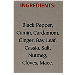 Black Pepper, Cumin, Cardamom, Ginger, Bay Leaf, Cassia, Salt, Netmeg, Mace, Clove.