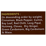 Cinnamon, Black Pepper, Cumin, Bay Leaf, Red Chilli, Salt, Nutmeg, Cloves, Dry Ginger, Green Cardamom, Big Cardamom & Mace.