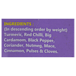 Turmeric, Red Chilli, Big Cardamom, Black Pepper, Coriander, Nutmeg, Mace, Cinnamon, Pulses & Cloves. Edible Iodized Salt By Weight On Dry Basis.