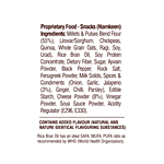 Millets & Pulses Blend - Flour (Jowar/Sorghum, Chickpeas, Quinoa, Whole Grain Oats, Ragi, Soy, Urad), Rice Bran Oil, Soy Protein Concentrate, Oats Fibre, Sugar, Iodised Salt, Cheese Powder, Milk Solids (Cheese Powder), Dehydrated Vegetable (Onion, Garlic), Corn Starch, Spices and Herbs (Jalapeno, Ginger, Chili, Parsley), Vinegar Powder, Soya Sauce Powder, Acidifying Agency (E296).