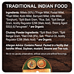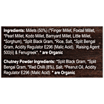 • Millets (50%) Finger Millet, Foxtail Millet, Pearl Millet, Kodo Millet, Barnyard Millet, Little Millet, Sorghum), Split Black gram, Rice, Salt, Split Bengal gram, Amaranth, Acidity Regulator 330, Raising Agent 500 (ii), Fenugreek. Ingredients with are organic.