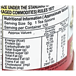 Nutrition per gram/ml: 100g Serving Size: 5g Energy (Kcal): 97.86 kcal Protein (g): 1.29 g Carbohydrate (g): 20.25 g Total Sugar (g): 7.24 g Added sugar (g): 5.42 g Total Fat (g): 1.30 g Saturated Fat (g): 0 g Trans Fat (g): 1.31 g Cholesterol (mg): < 1.0 mg Sodium (mg): 2947.93 mg