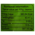 Nutrition per gram/ml: 100g Energy Value: 383.64 Kcal Carbohydrate: 83.41 g Fat: 0.05 g Protein: 10.93 g Sodium: 307.18 mg