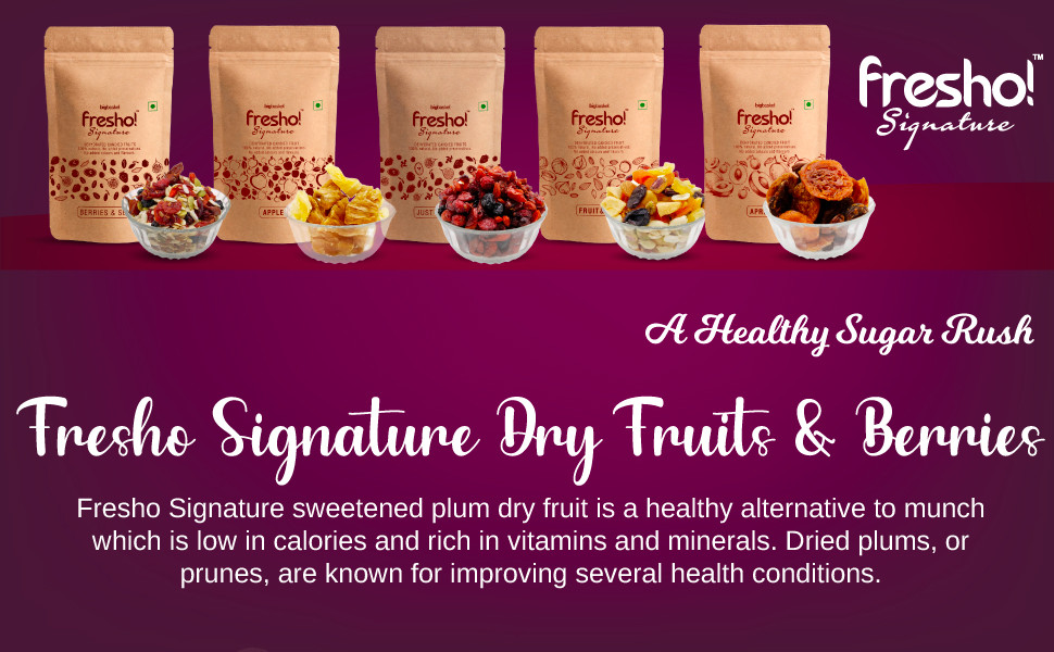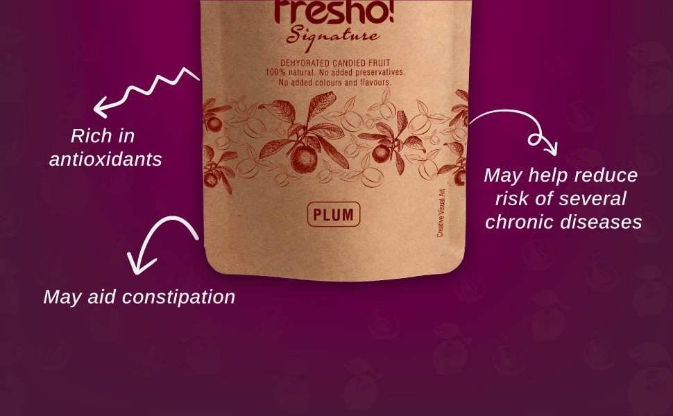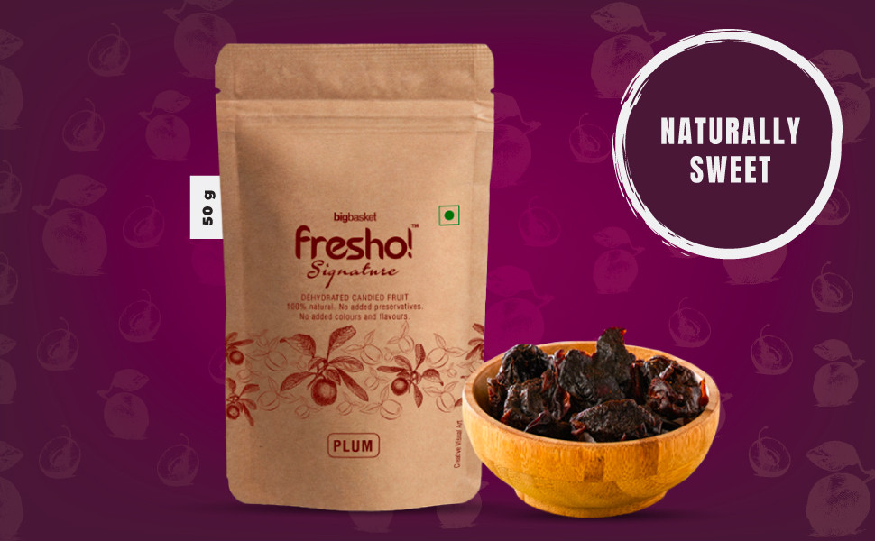 About the productFresho Signature presents an array of dry fruits apart from the ordinary to give you the best of the best to indulge. Want to try something other than a regular fruit? This sweetened plum dry fruit is a healthy alternative to munch on when hunger strikes. It contains plum fruit and sulphurless sugar. Easy to carry, it makes a great snack to keep you going throughout the day. Our candied dry fruit range is here to be your snack buddy and your healthy sugar high. It can also be used as some sweet goodness to your breakfast cereals, for baking, as dessert toppings and to make traditional sweets. They are sweetened with sulphurless sugar and liquid glucose to enhance the zing. There are 0 added preservatives, artificial colour and flavour to retain the original fruit essence and keep it natural and healthy.