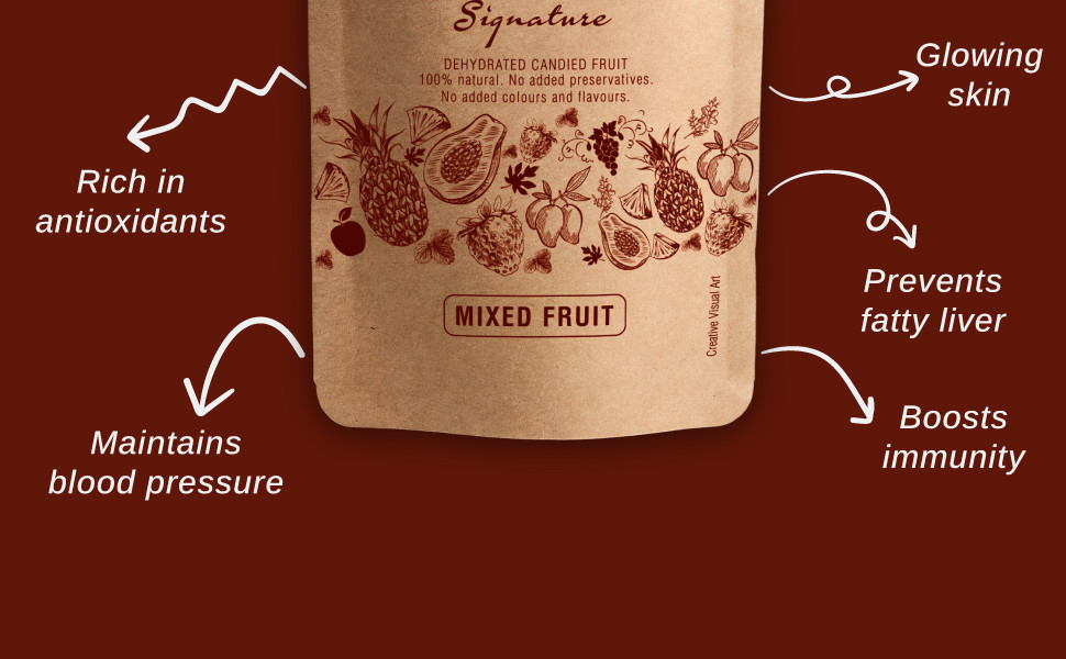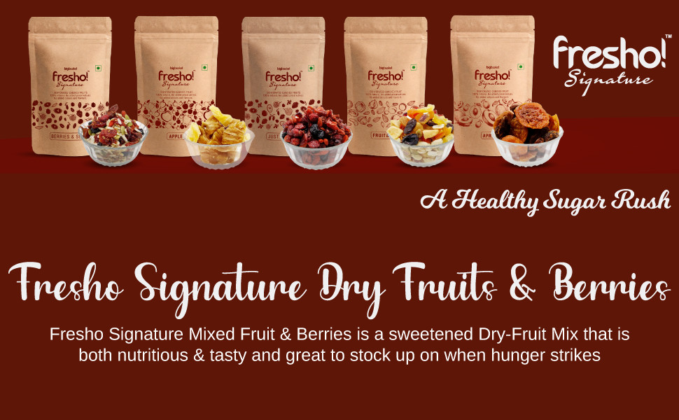 About the productFresho Signature presents an array of dry fruits apart from the ordinary to give you the best of the best to indulge. Want to try something other than a regular fruit? This sweetened dry fruit mix is a healthy alternative to munch on when hunger strikes. It contains papaya, apple, pineapple, mango, black grape, strawberry and sulphurless sugar. Easy to carry, it makes a great snack to keep you going throughout the day. Our candied dry fruit range is here to be your snack buddy and your healthy sugar high. It can also be used as some sweet goodness to your breakfast cereals, for baking, as dessert toppings and to make traditional sweets. They are sweetened with sulphurless sugar and liquid glucose to enhance the zing. There are 0 added preservatives, artificial colour and flavour to retain the original fruit essence and keep it natural and healthy.