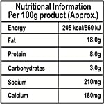 Nutrition per gram/ml: 100g Energy: 205 kcal/860 kJ Fat: 18.0g Protein: 8.0g Carbohydrates: 3.0g Sodium: 210mg Calcium: 180mg