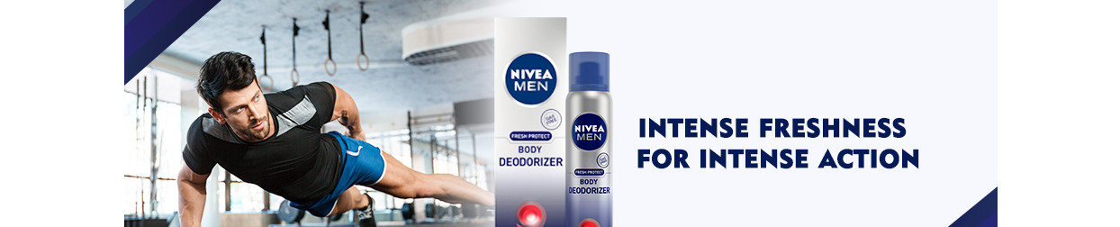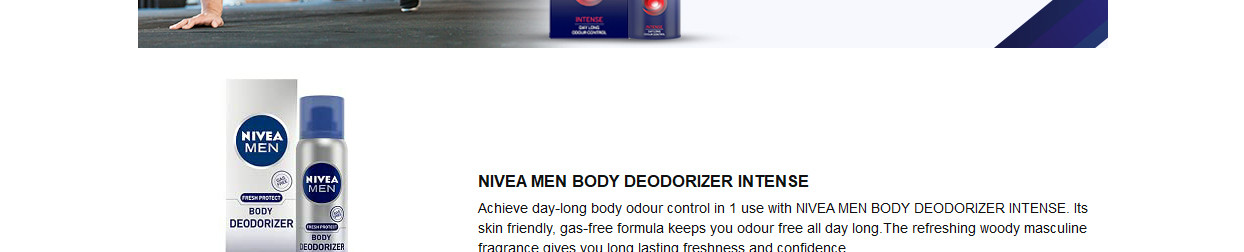 Nivea Men Body Deodorizer Intense gives you an intense feeling of freshness all day long. The fragrance has a lemon, green leaves and watermint top notes, jasmine, and rosewood heart notes, and amber, cedarwood and musk base notes.
