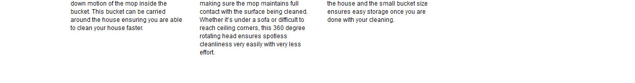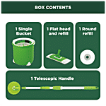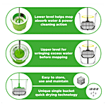 About the ProductUnique one bucket spin mop that enables cleaning and wringing of the mop in same bucket. Strong and sturdy bucket with unique, first-time flat refill head that gives sparkling clean floor always! Unique easy clean surface in refills for better which cleans with 360-degree rotating heads that go under furniture easily. Easy water drainage, strong and sturdy bucket with lightweight handle ensures ease of use