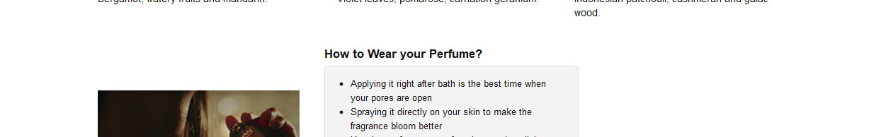 About the productApplying it right after the bath is the best time when your pores are open, spraying it directly on your skin to make the fragrance bloom better, keeping perfumes away from heat and sunlight makes it last longer. Moisturising, before you apply the perfume, makes the fragrance last longer.