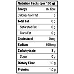 Nutrition per gram/ml: 100g Energy: 16 Kcal Calories from fat: 6 Total Fat: 0g Saturated Fat: 0g Trans Fat: 0g Cholesterol: 0mg Sodium: 860mg Carbohydrate: 3g Sugar: 0g Dietary Fiber: 1.0g Proteins: 1.0g
