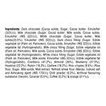 Dark Chocolate ( Cocoa Mass, Sugar, Cocoa Butter, Emulsifier - Soya Lecithin, Natural Vanilla Flavour), Milk Chocolate ( Cocoa Mass, Sugar, Cocoa Butter, Milk Solids, Emulsifier - Soya Lecithin, Natural Vanilla Flavour), White Chocolate ( Milk Solids, Milk Fat, Cocoa Butter, Sugar, Emulsifier - Soya Lecithin, Natural Vanilla Flavour), Refined Sugar, Fruit pulp (Orange, Raspberry, Blueberry, Passion, Fresh Lemon juice, Mango ), Water, Glucose, Mixed Spice, Honey, Salt, Blueberry powder, Hazelnut, Pistachio, Neutralizing Agent (Citric acid), Emulsifiers and Stabilizers (Pectin). Contains Permitted Natural And Synthetic Food Colour (E171, E172, E120, E129)