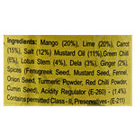 Mango (20%), Lime (20%), Carrot (15%), Salt (12%), Mustard Oil (11%), Grren Chilli (6%), Lotus Stem (4%), Dela (3%), Ginger (2%), Spices (Fenugreek Seed, Mustard Seed, Turmeric Powder, Red Chilli Powder, Cumin Seed), Acidity Regulator (E-260)- (14%), Contains Permitted Class -Ii, Preservatives (E-211).