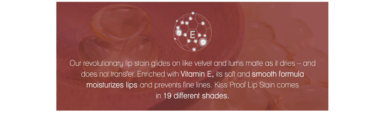 What if we told you that you could have all-day colour that always looked fresh and felt as if you were wearing nothing? If this sounds too good to be true, our Kiss Proof Lip Stain will make you a believer. This liquid-based lip stain can last up to 12 hours and will endure anything from the messiest meal to the most passionate kiss. The colour stays exactly where you’ve applied it and will not smudge or transfer on to cups, clothes or skin. With a range of exciting shades, our revolutionary lip stain glides on like velvet and turns matte as it dries. This product is formulated in Italy.
