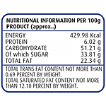 Nutrition_per: 100g Energy: 429.98 Kcal Protein: 6.02 g Carbohydrate: 51.21 g Of which Sugar: 33.81 g Total Fat: 22.34 g Total Trans Fat Content: Not more than 0.69 percent by weight Total Saturated Fat Content: Not more than 12.10 percent by weight