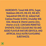 Toned Milk (89%), Sugar, Stabilizers (INS 415, INS 412, INS 407), Sequestrant (INS 451 (i)), Iodized Salt, Cashew Powder (0.05%), Emulsifier (INS 436), Mineral & Vitamin Premix (Zinc, Vitamin A & D). Contains Permitted Synthetic Food Colour (Ins 110) And Added Flavour (Nature Identical And Artificial (Kaju Katri) Flavouring Substances).
