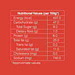 Nutrition per gram/ml: 100g Energy (kcal): 437.0 Carbohydrate (g): 47.0 Total Sugar (g): 9.0 Dietary fibre (g): 1.0 Protein (g): 6.0 Total fat (g): 25.0 Trans fat (g): 0.0 Saturated fat (g): 11.0 Cholesterol (mg): 0.0 Sodium (mg): 740.0