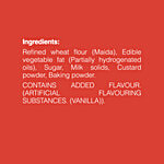 Refind Wheat Flour, Sugar,butter,Cardamom,milk Solids, Vanilla &Essence(Artficial & Natural Flavoring),custard powder,salt(Iodised),Edible Vegetable Fat,Palmolein Oil,Raisng agent(E500)