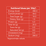 Nutrition per gram/ml: 100g Energy (kcal): 396.0 Carbohydrate (g): 49.0 Total Sugar (g): 16.0 Dietary fibre (g): 1.0 Protein (g): 5.0 Total fat (g): 20.0 Trans fat (g): 0.0 Saturated fat (g): 9.0 Cholesterol (mg): 0.0 Sodium (mg): 280.0