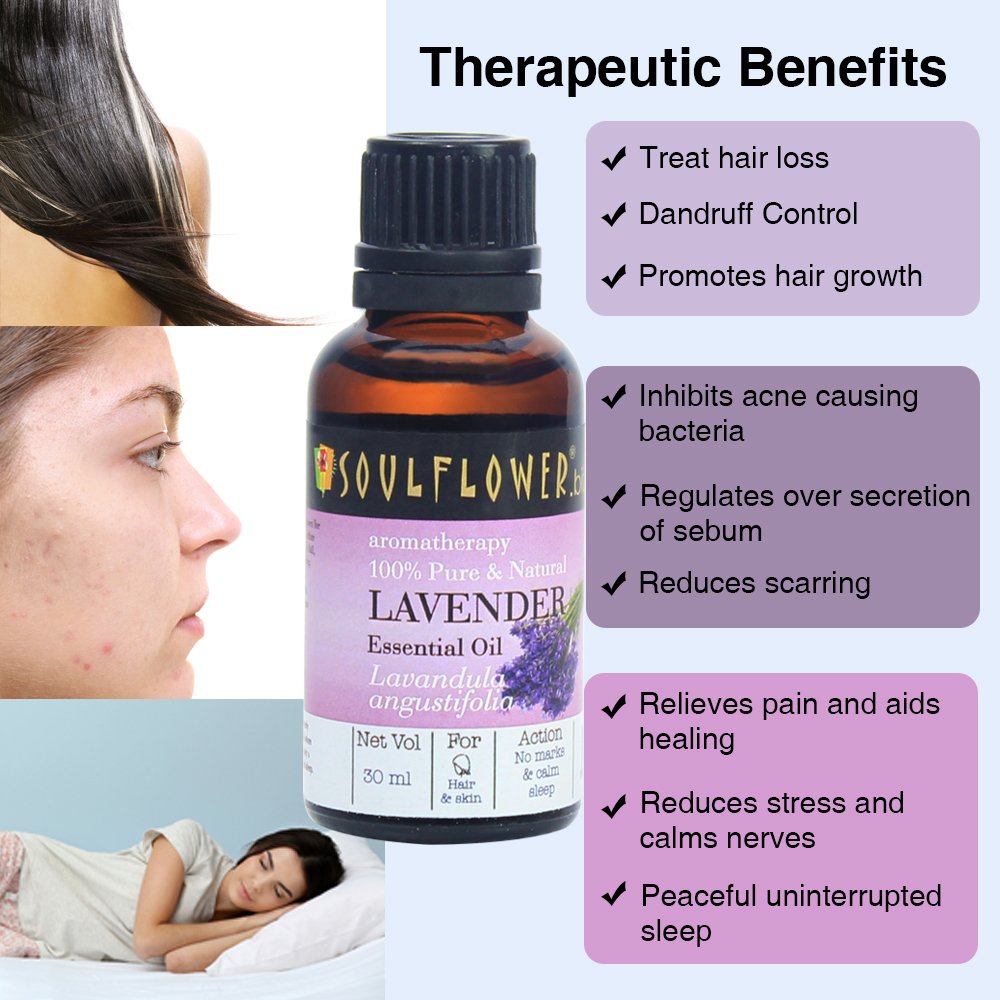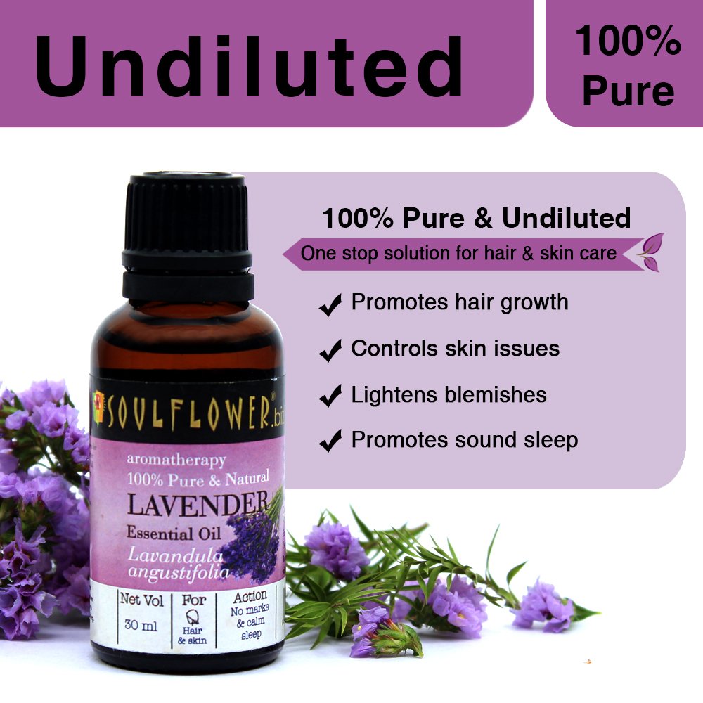 100% pure, natural and vegan Soulflower Lavender Essential Oil controls acne and hair fall, soothes skin or scalp irritation, lightens blemishes, and promotes blood circulation giving you a calm and relaxed sleep.