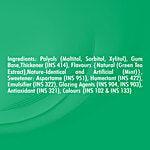 Polyols (Maltitol, Sorbitol, Xylitol), Gum Base, Thickener (INS 414), Flavours (Natural (Green Tea Extract), Nature-Identical and Artificial (Mint)), Sweetener: Aspartame (INS 951), Humectant (INS 422), Emulsifier (INS 322), Glazing Agents (INS 94, INS 93), Antioxidant (INS 321), Colours (INS 12 & INS 133)