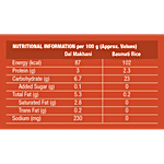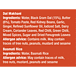 • Dal Makhani: Water, Black Gram Dal, Butter, Tomato Paste, Red Kidney Beans, Garlic, Ginger, Refined Sunflower Oil, Salt, Dairy Cream, Coriander Leaves, Chilli Powder, Green Chilli, Mixed Spices, Sugar, Fenugreek Leaf Powder