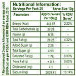 Nutrition per gram/ml: 100g Serving Size: 10g Energy (Kcal): 443.97 Total Carbohydrate (g): 39.28 Protein (g): 8.15 Total Fat (g): 28.25 Added Sugar (g): 2.28 Total Sugar (g): 4.99 Saturated Fat (g): 1.76 Trans Fat (g): < 0.1 Cholesterol (mg): <1 Sodium (mg): 2628.81