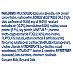 Ingredients: Milk solids (calcium caseinate, milk protein concentrate), maltodextrin, edible vegetable oils (high oleic sunflower oil 9.5%, soy oil 6.0%), resistant maltodextrin 10.0%, isomaltulose 8.5%, maltitol, cocoa powder 5.5%, soy protein, minerals**, fructose, fructo-oligosaccharide (FOS) 2.36%, myo-inositol, flavours (natural, nature-identical & artificial [vanilla] flavouring substances), oat fibre, stabiliser (carrageenan), choline chloride, antioxidants (soy lecithin, mixed tocopherols), vitamins***, taurine, L-carnitine, sweetener (sucralose), beta-carotene, chromium picolinate.