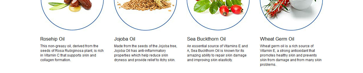 Seabuckthorn oil, Rosehip Oil, Wheatgerm Oil, Jojoba Oil