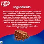 Milk Chocolate (68.8%) (Sugar, Milk Solids (16.6%), Cocoa Butter (12%), Cocoa Solids (8.2%), Emulsifier (Soya Lecithin) & Artificial (Vanilla) Flavouring Substances), Wafer (Refined Wheat Flour (Maida), Sugar, Hydrogenated Vegetable Fats, Cocoa Solids (1.5%), Milk Solids, Fractionated Vegetable Fat, Yeast, Raising Agent (500(ii)), Emulsifier (Soya Lecithin), Iodised Salt, Flour Treatment Agent (516), Artificial (Vanilla) Flavouring Substances & Nature-Identical Flavouring Substances).