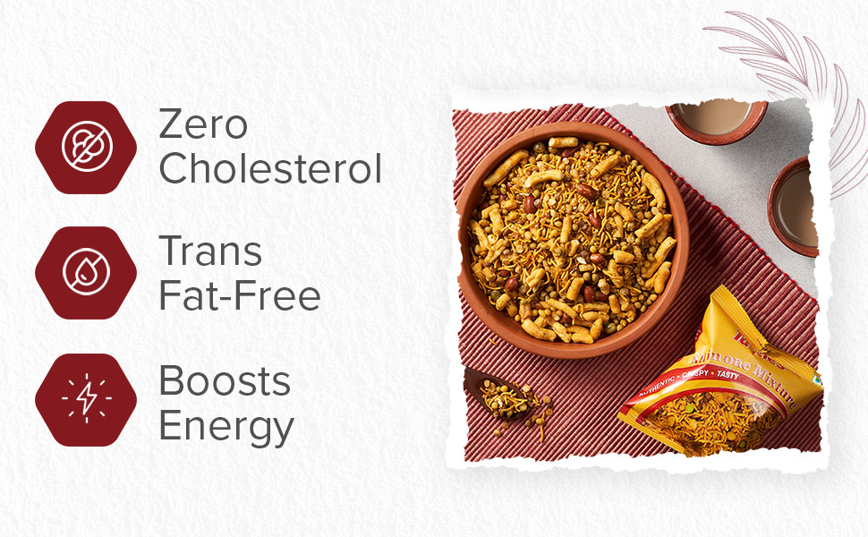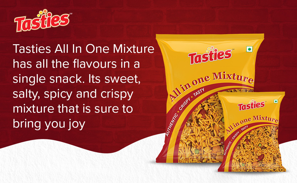 Celebrate snack time with your family and friends with Tasties Namkeen - All In One Mixture and enjoy the texture of this snack in all its glory. Mixed with Indian spices and chickpea flour, these treats are handpicked and specially made for you. The All In One Mixture is packed with flavour and authenticity and is the perfect accompaniment to evening tea or coffee. Refreshing and crunchy, these snacks are the perfect quick bites you need to satisfy your cravings.