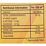 Tonned Milk, Badam Powder, sugar. Contains added flavour (Natural flavouring substance - Saffron). Nutritional information per 100ml. Energy - 93.3 kcal, Total Carbohydrates of which Sugars (lactose - 5.0g, Sucrose - 8.7g) - 13.7g, Proteins - 2.9g, Total Fat - 3.0g, Minerals (Calcium ) - 65g