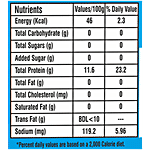 Natural Whole EggNutrition per gram: 100g Energy (Kcal): 46 Kcal Total Carbohydrate (g): 0 g Total Sugars (g): 0 g Added Sugar (g): 0 g Total Protein (g): 11.6 g Total Fat (g): 0 g Total Cholesterol (mg): BDL<10 mg Saturated Fat (g): 0 g Trans Fat (g): 0 g Sodium (mg): 119.2 mg