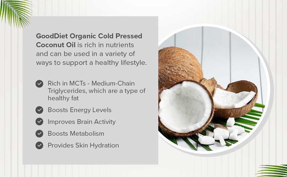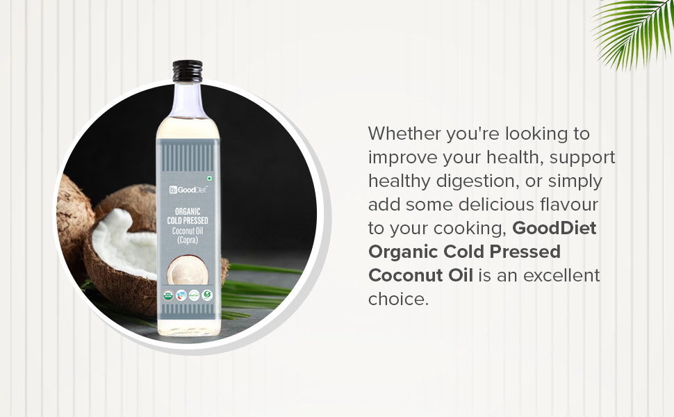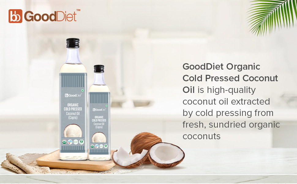 About the productBigbasket, a domestic online supermarket, has launched a new healthy range of foods called a GoodDiet comprising ready-to-cook mixes, roasted snacks, and other superfoods. This category of products comes after the recent launch of its ready-to-eat range of salads and single serves. GoodDiet Organic Cold Pressed Coconut Oil is made from organic coconuts that are carefully sundried to bring out the flavours and aroma. This oil is perfect for cooking wholesome and nutritious meals. It also brings shine and smoothness to the skin and hair. It has the aroma of dried coconut and a pleasant coconut flavour. Also explore GoodDiet's full range of Organic and Cold Pressed oils.
