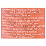Aqua (Water), Polysorbate 20, Sodium Laurate Sulfate, PEG-150 Distearat, Lauryl Betaine, Sodium Chloride, Phenoxyethanol, Sodium Cocoamphoacetate, Disodium Cocoamphoacetate, Glycerin, Parfum (Fragrance), Imidazolindinyl Urea, Disodium EDTA, PPG-2 Hydroxyethyl Cocamide, Citric Acid, Olea Europaea (Olive) Fruit Oil, Benzophenone-4, Chamomilla Recutita(Matricaria) Flower Extract, Polyquaternium-10, CI 15985 (Yellow 6), CI 19140 (Yellow 5. Paraben-Free.