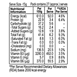 Nutrition_per: 100g Serving_Size: 15g Energy (kcal): 613.0 kcal Protein (g): 22.9 g Carbohydrate (g): 37.2 g Total Sugars (g): 16.2 g Added Sugars (g): 12.8 g Total Fat (g): 41.4 g Saturated Fat (g): 8.8 g Trans Fat (g): 0.0 g Cholesterol (mg): 0.0 mg Sodium (mg): 136.5 mg Vitamin B3 (µg): 3280.0 µg Vitamin E (mg): 5.7 mg Vitamin B6 (µg): 370.0 µg %RDA: RDA basis 2000 kcal energy