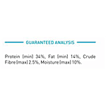 Nutrition per gram/ml: 100g Protein (min): 34% Fat (min): 14% Crude Fibre (max): 2.5% Moisture (max): 10%