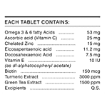 Nutrition per gram/ml: per tablet Serving Size: 1 to 2 tablets for up to 20kg body weight, 2 to 4 tablets for more than 20kg body weight Omega 3 & 6 fatty Acids: 53 mg Ascorbic acid (Vitamin C): 25 mg Chelated Zinc: 15 mg Eicosapentaenoic acid: 11.2 mg Docosahexaenoic Acid: 7.5 mg Vitamin E: 10 IU (as dl-alphatocopheryl acetate) Biotin: 150 mcg Turmeric Extract: 3000 ppm Green Tea Extract: 1500 ppm