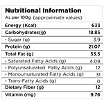633 kcal / 100 g RICH IN PROTEIN: 20g of protein in 100g (approx), which helps in building muscle and strength. RICH IN VITAMIN E which builds the body's immune system and helps to fight viral infections. HIGH IN DIETARY FIBRE: Helps to maintain a healthy digestive system by promoting regular bowel movements.