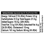 Nutrition per gram/ml: 100g Serving Size: 90 g Energy: 168 kcal Protein: 3.5 g Carbohydrate: 21.5 g Total Sugars: 21.5 g Added Sugars: 15.5 g Total Fat: 7.5 g Saturated Fat: 6 g Cholesterol: 15 mg Calcium: 161 mg Sodium: 88 mg