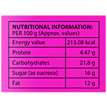Nutrition per gram/ml: 100g Energy value: 213.08 kcal Protein: 4.47 g Carbohydrates: 21.8 g Sugar (as sucrose): 16 g Fat: 12 g