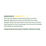 Maize , Oats , Ragi , Sorghum , Soya , Rice , Seasoning [Sugar , Corn Starch , Dehydrated Vegetables (Onion , Garlic), Salt , Milk Solids , Cheese Powder , Maltodextrin , Mixed Spices (Chilli , Pepper), Tomato Powder , Soya Sauce Powder , Acidity Regulator (Citric Acid ), Anticaking Agent (Silicon Dioxide) and Asafoetida], Edible Vegetable Oil , Dehydrated Poatao.