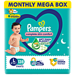 New Pampers complete skin comfort pants have ANTI-RASH* lotion with vitamin E & aloe vera, to keep your baby’s skin protected. Newborn baby diapers containing Lotion with Vitamin E & Aloe vera helps protect your baby’s delicate skin from diaper rash and irritation. Best diapers with Ultra Absorb Core, provide your baby a new type of dryness overnight - breathable dryness. Magic gel locks wetness away to provide up to 12 hours of dryness. The new and improved product design enables a comfortable fit, closer to the baby’s body and a flexible waist band that adapts to baby’s movements for a comfortable fit.