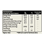 Nutrition per gram/ml: 100g Serving Size: 10g Energy (Kcal): 900.0 kcal Total fat (g): 100.0 g Saturated fat (g): 19.4 g Monounsaturated fatty acid (g): 55.6 g Polyunsaturated fatty acid (g): 25.0 g Omega-6 fatty acid (mg): 25002 mg Sodium (mg): 1.5 mg