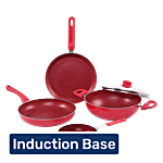 Wonderchef Royal Velvet Induction Base Non-Stick Cookware Set - Red, Fry Pan 24 cm (1.8 L) + Wok with Glass Lid 24 cm (2.7 L) + Dosa Tawa 24 cm + Mini Fry Pan 14 cm, Aluminium, 3 mm